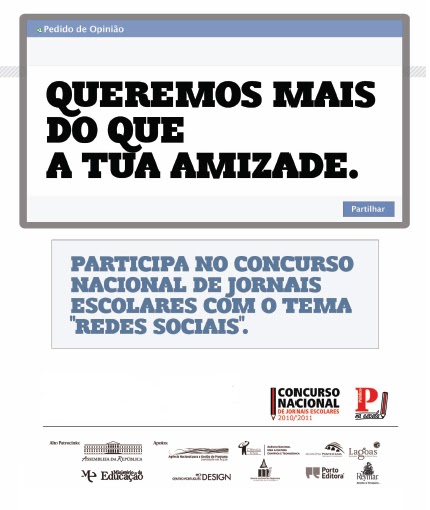 O ano de 2010 veio tornar evidente o interesse crescente dos internautas pelas redes sociais. Em Portugal, como em muitos outros países, elas estão entre as palavras mais pesquisadas no Google. Sabendo que a utilização das redes sociais tem vantagens e desvantagens, pode-se colocar às escolas um desafio educativo: conhecer cada rede social, identificar riscos e benefícios e rentabilizar o seu uso no trabalho escolar. O Projecto Público na Escola lança esta proposta para o ano lectivo de 2010/2011, através do Concurso Nacional de Jornais Escolares, com o tema As Redes Sociais.