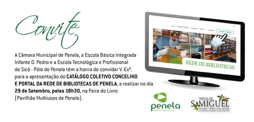 A apresentação do Catálogo Coletivo Concelhio e Portal da Rede de Bibliotecas de Penela vai ter lugar no próximo dia 29 de setembro, pelas 18h30, na Feira do Livro. Estão todos convidados para assistir!