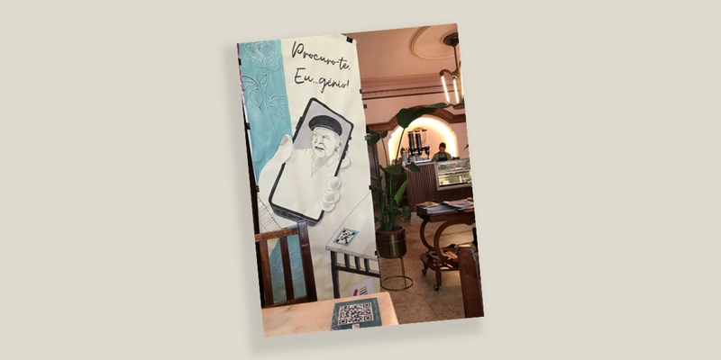 E tudo para. Subitamente, a música inunda a biblioteca e tudo parece ficar suspenso no tempo e no espaço. Ouve-se uma melodia que tod@s conhecem, e tod@s se viram para lá, para esse sítio onde ele está, encostado à parede, e por cima do qual notas musicais se desprendem e parecem querer chegar ao céu. E o seu banquinho, aproveitado de uma antiga sala de trabalhos oficinais, e cujo tampo de madeira, duro e desgastado pelo tempo, foi forrado, por nós, claro, com um tecido estampado com livros, muitos livros de várias cores e tamanhos, porque, sim, estamos na biblioteca.