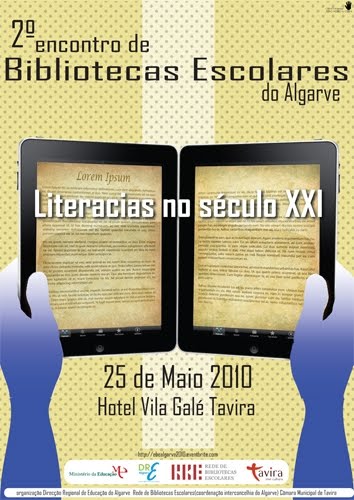 Cartaz do 2º Encontro de Bibliotecas Escolares do Algarve, que irá decorrer a 25 de Maio no Hotel Vila Galé Tavira.