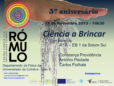 Para quem está em Coimbra ou aí se possa deslocar na 2ª feira, dia 25 de novembro, deixamos o convite para participar no 5º aniverário do Rómulo Centro Ciência Viva daquela cidade: às 14h30, uma sessão de Ciência a Brincar, que vai ser protagonizada pela turma 4º A, da EB1 Solum Sul; pelas 16h30, uma homenagem ao prof. Galopim de Carvalho. A entrada é livre.