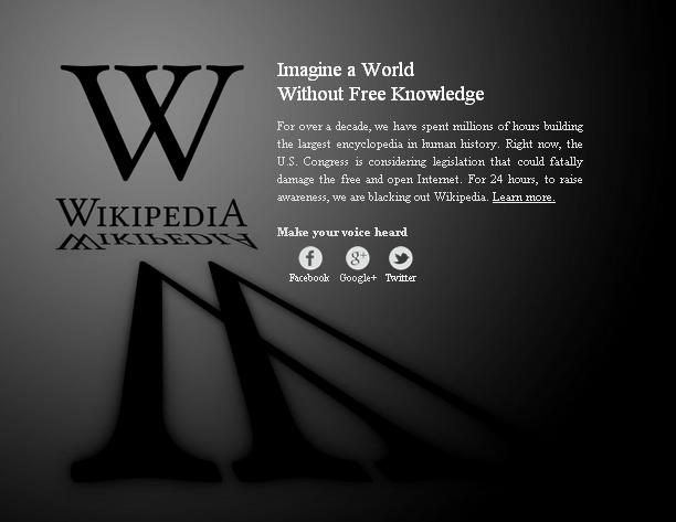 A Wikimedia Foundation decidiu bloquear o acesso, hoje, em todo o mundo, à versão em língua inglesa da Wikipedia, em sinal de protesto contra as proposta de lei americanas Stop Online Piracy Act (SOPA) e Preventing Real Online Threats to Economic Creativity and Theft of Intellectual Property Act (PIPA). Os dois projetos legislativos pretendem combater a pirataria e a violação dos direitos de autor na internet. A Wikipedia e outros sítios de referência como o Google ou o Wordpress, que se uniram ao protesto, alegam que o enquadramento jurídico proposto pelas SOPA e PIPA pode condicionar a liberdade intelectual e alterar completamente a estrutura aberta e dinâmica da internet.