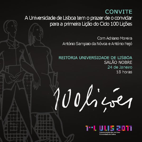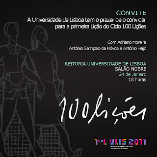 As comemorações dos 100 Anos da Universidade de Lisboa vão ser assinaladas com o programa "100" lições", constituído por um ciclo de palestras que terão início hoje, 24 de Janeiro no Salão Nobre da Reitoria, com a presença do Reitor da Universidade de Lisboa, António Nóvoa, do coordenador da acção, António Feijó, e do primeiro palestrante, Adriano Moreira.