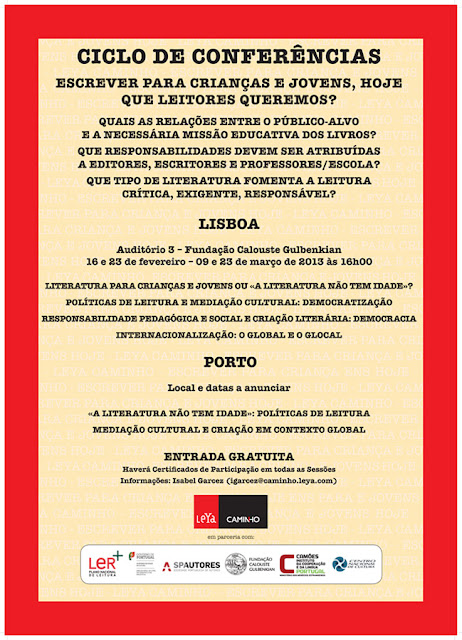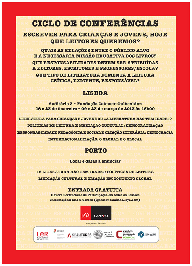 Qui | 24.01.13 Ciclo de Conferências sobre "Escrita para crianças e jovens, que leitores queremos?" _____________________________________________________________________________________________________________________ Este trabalho está licenciado sob licença: CC BY-NC-SA 4.0 Tweetar Tags:difusão da informaçãoliteratura infantojuvenil link comentar favorito