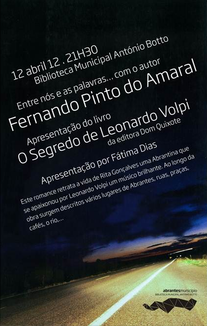 Fernando Pinto do Amaral, comissário do Plano Nacional de Leitura, professor universitário e escritor, vai estar hoje na Biblioteca Municipal António Botto. Embora mais conhecido como poeta e crítico literário, o autor desloca-se à Biblioteca de Abrantes para falar sobre o romance que publicou em 2009 e cuja ação perpassa, justamente, por vários locais daquela cidade.