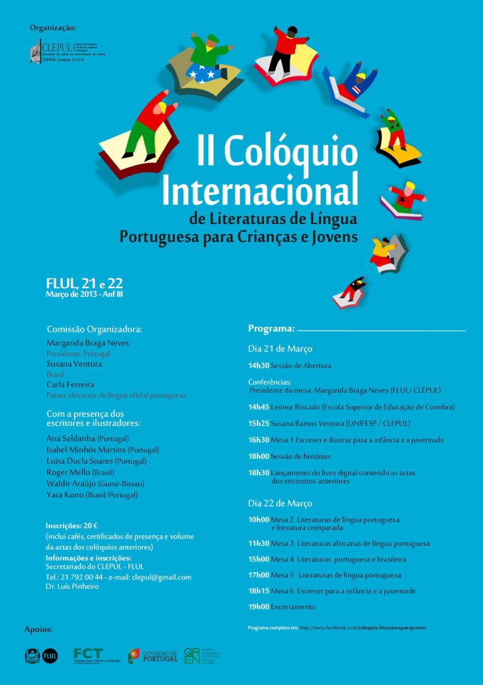 O programa do II Colóquio Internacional de Literatura de Língua Portuguesa para Crianças e Jovens, a decorrer nos próximos dias 21 e 22 de março na FLUL. Os interessados em assistirem aos trabalhos deverão contactar o CLEPUL pelo email clepul@gmail.com.