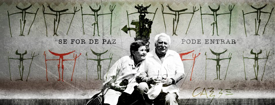 O escritor Jorge Amado e a sua mulher Zélia Gattai em frente de um painel com figuras representando Exu, uma divindade Orixá de origem africana. Guardião de templos, casas, cidades e pessoas, mensageiro e intermediário entre deuses e homens, entre mundo espiritual e mundo material, Exu foi escolhido por Jorge Amado para guardião da sua casa, a Fundação Casa de Jorge Amado. As três cores com que a divindade aparece representam a mistura de raças existentes no Brasil: índios, negros e brancos.