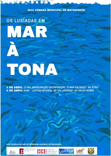 Vai ter lugar amanhã, dia 4 de abril, entre as 9h e as 18h, no salão nobre da Câmara Municipal de Matosinhos (CMM), o evento Os Lusíadas em Mar à Tona, numa iniciativa conjunta das Bibliotecas Escolares do concelho e da Biblioteca Municipal. Esta realização – que é ainda completada por iniciativas várias em cada Agrupamento ou Escola – insere-se no projeto Ler+Mar, do Plano Nacional de Leitura, organismo que apoiou as escolas na promoção das atividades. Do programa constam intervenções de alunos e professores de todos os Agrupamentos e Escolas de Matosinhos mas, cada um deles leva convidados que também participam na leitura: associações concelhias, um lar de 3.ª idade, associações de pais e outras. A leitura será acompanhada por teatros de sombras sobre os Descobrimentos feitos pelos alunos e professores de EV/EVT, e por momentos musicais assegurados por alunos que frequentam Escolas de Música do concelho. No exterior (ou no átrio da CMM) haverá ainda um teatro de rua por alunos do 1.º ciclo, dinamizado por uma professora das A.E.C., igualmente sobre os Descobrimentos e o Mar. A exposição patente desde hoje, 3 de abril, no átrio da CMM, apresenta textos sobre o mar e material cedido por uma associação de pescadores, a NAPESMAT.