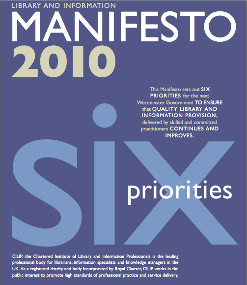 A CILIP (Chartered Institute of Library and Information Professionals) publicou o Manifesto 2010 que clarifica quais são as seis prioridades que o governo britânico deve adoptar em relação às bibliotecas e informação: 1. Tornar obrigatórias as bibliotecas 2. Direitos de Informação 3. Gestão de Informação 4. Preservar a herança cultural do Reino Unido 5. Saúde pública 6. Direitos dos utilizadores.