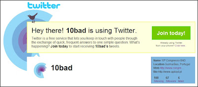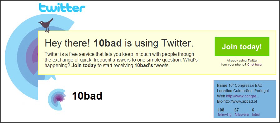 Qua | 07.04.10 O 10º Congresso BAD no Twitter Pode seguir no Twitter o 10º Congresso BAD que está a decorrer em Guimarães.Aceder no Twitter 10badou no Blogue congressobad _____________________________________________________________________________________________________________________ Este trabalho está licenciado sob licença: CC BY-NC-SA 4.0 Tweetar Tags:associações de bibliotecas e bibliotecárredes sociais link comentar favorito