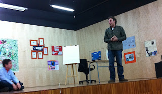 O escritor e ilustrador Pedro Soromenho esteve ontem na EB de Matosinhos. Foi a 2ª vez que ali se deslocou e percebe-se a razão: um auditório cheio de alunos, muito atentos, muito conhecedores da obra, muito entusiasmados durante todo o tempo em que o escritor falou da sua obra. Aliás, Pedro Soromenho é um comunicador que prende a atenção desde o primeiro momento. Acompanha a conversa com ilustrações que vai fazendo e essa faceta deixa o seu jovem público completamente rendido. As perguntas que lhe foram colocadas revelavam uma preparação cuidadosa e a sessão de autógrafos foi longa pois muitos foram os alunos que não resistiram a adquirir um livro, até porque o Pedro Soromenho oferece um extra: um original desenho!