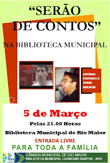 Qua | 03.03.10 Serão de contos na BM de Rio Maior Dia 5 de Março às 21.00 horas, na Biblioteca Municipal de Rio Maior.Para todo o tipo de público. _____________________________________________________________________________________________________________________ Este trabalho está licenciado sob licença: CC BY-NC-SA 4.0 Tweetar Tags:bibliotecas link comentar favorito