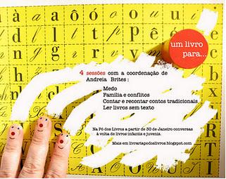 A 30 de janeiro, realiza-se na Pó dos livros a primeira sessão de "um livro para...", com a coordenação de Andreia Brites. Em cada encontro divulgaremos e conversaremos sobre alguns livros infantis e juvenis, de acordo com o tema anunciado. Falaremos da qualidade dos livros, dos seus potenciais leitores preferenciais e de como os adultos poderão mediar a leitura. Os temas não se esgotam nestes encontros, com eles pretendemos apenas abrir caminho aos mediadores que tantas vezes se questionam se aquele é o melhor livro para as suas crianças..As sessões realizam-se quinzenalmente, às segundas-feiras, em horário pós-laboral, das 19h30 às 21h00.