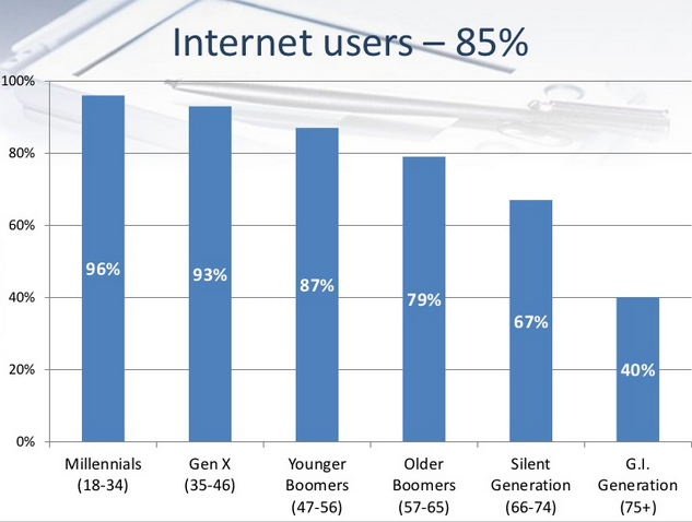 A percentagem de utilização da internet das diferentes gerações de cidadãos americanos, segundo o estudo Senior Citizens and Digital Technology, que inclui outros dados comparativos, em termos geracionais, sobre o uso da internet.