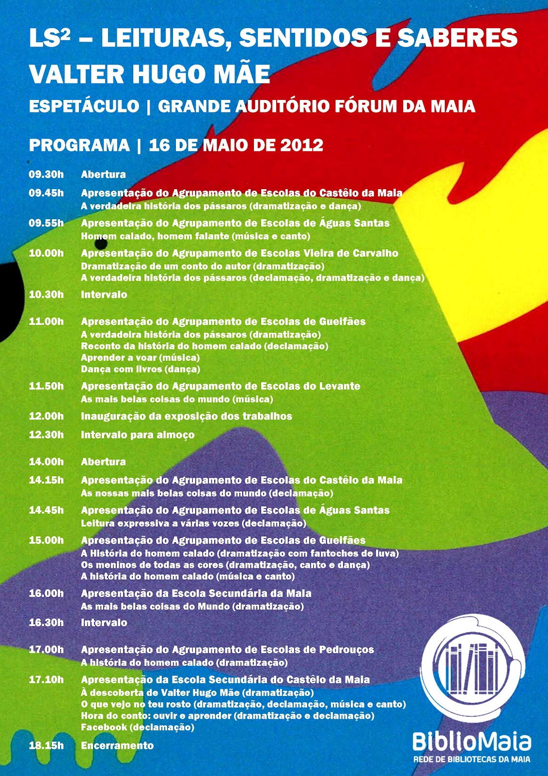 Esta é mais uma edição do LS2 (Leituras e Saberes ao Quadrado), uma iniciativa conjunta da Biblioteca Municipal Dr José Vieira de Carvalho e as bibliotecas escolares do concelho da Maia. Em cada ano se escolhe um escritor cuja obra é lida pelos alunos de todas as escolas e, a partir dessa leitura, são preparadas diversas atividades que vão ter apresentação pública com a presença do respetivo escritor. Este ano, no dia 16 de maio, Valter Hugo Mãe estará neste encontro de leitura(s).