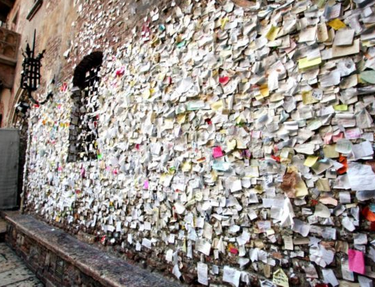 A imagem exibe as mensagens de amor afixadas debaixo da "varanda de Julieta", ex-libris de Verona (Itália), cidade onde se desenrolou a trágica história de amor entre Romeu e Julieta imortalizada por Shakespeare.